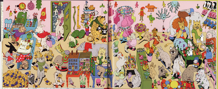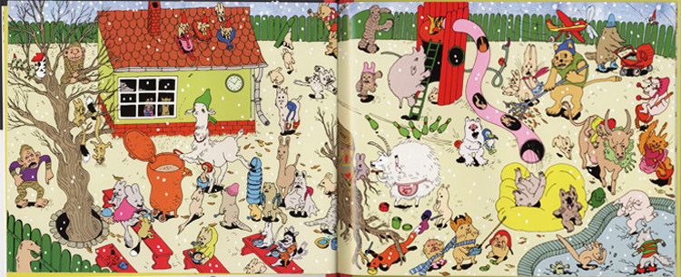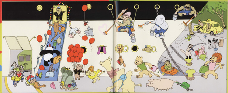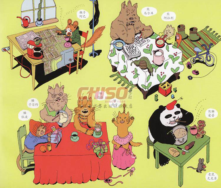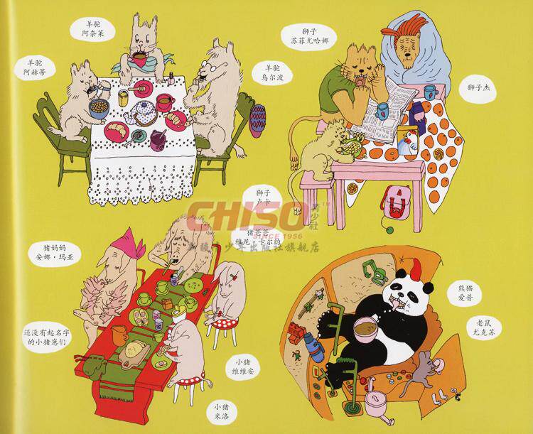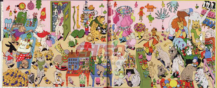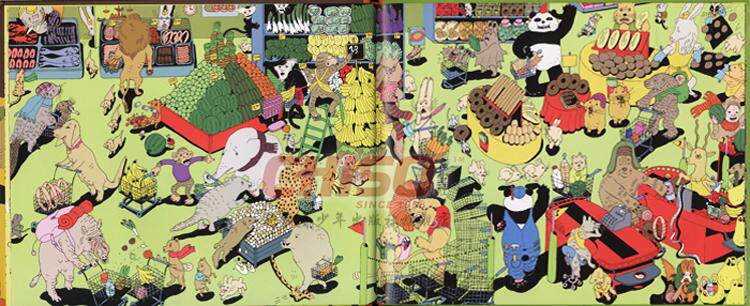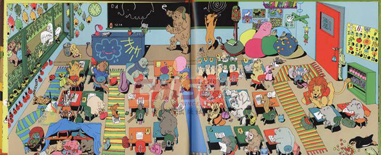 瞧,动物小镇的一天多么紧张和热闹,每一幅画面上都有各种各样的动物居民们在做各自的事情,刚开始让我们觉得有些眼花缭乱,不明白这本书到底在讲些什么。不过,小朋友们只要细心观察,就会发现:这本书是以时间为顺序,每一幅画面讲述了狼獾、野兔、狮子、猴子、猫咪、熊、熊猫和老鼠几个主要家庭在这一天的不同时间里发生的有趣故事。
