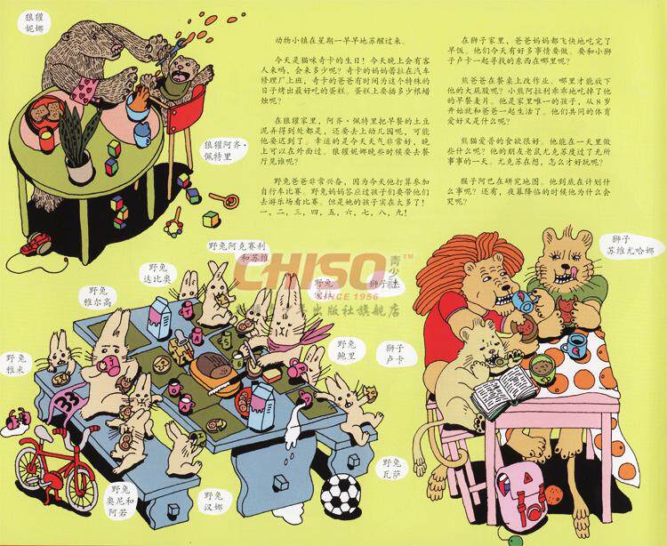 ![]() | 有评论家说:“一本好书,可以从多个角度阅读。” 浓艳的色彩、别具一格的形象、精彩纷呈的布局和独具匠心的情节设计,令这本书初读起来令人有些眼花缭乱;但是只要根据作者在封底和内文中留下的线索——“豪猪能去卖气球吗?为什么野兔爸爸那么兴奋?……他们共同的体育爱好是什么?”到对应的图画中去寻找,你会发现:这本书的设计非常独特、有趣!孩子会找得津津有味。丰富的表现力和独特的设计可以拓展孩子的发散性思维,培养他的逻辑思维能力和想象力。另外,这本书描绘了世界各地的野生动物,准确的注释了它们的学名。从这个角度讲,这本书又可以当作科普书,教孩子认识许多动物。 |