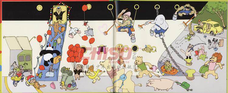 这是一本无字书,描绘了一天当中动物小镇里发生的有趣故事。